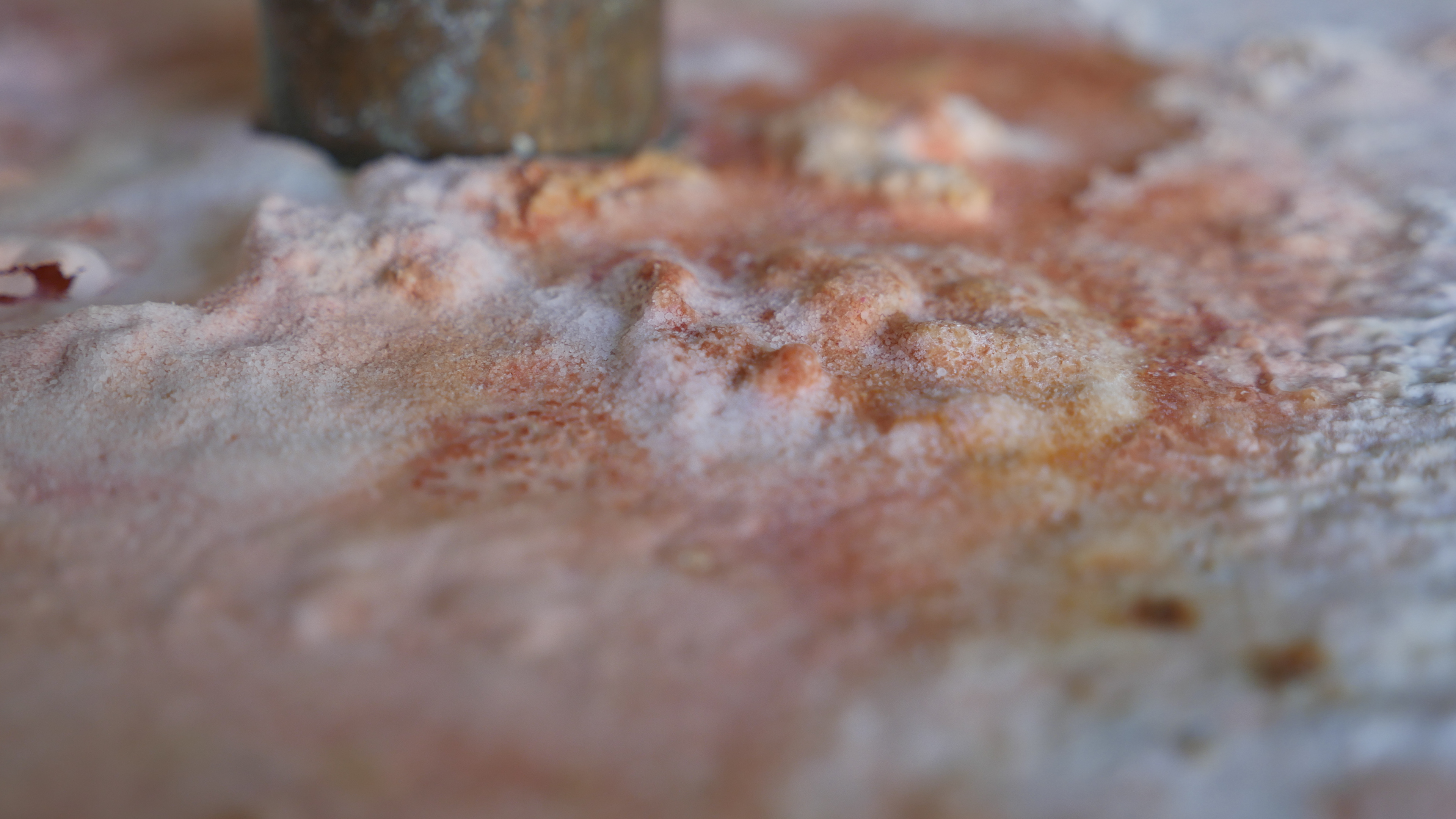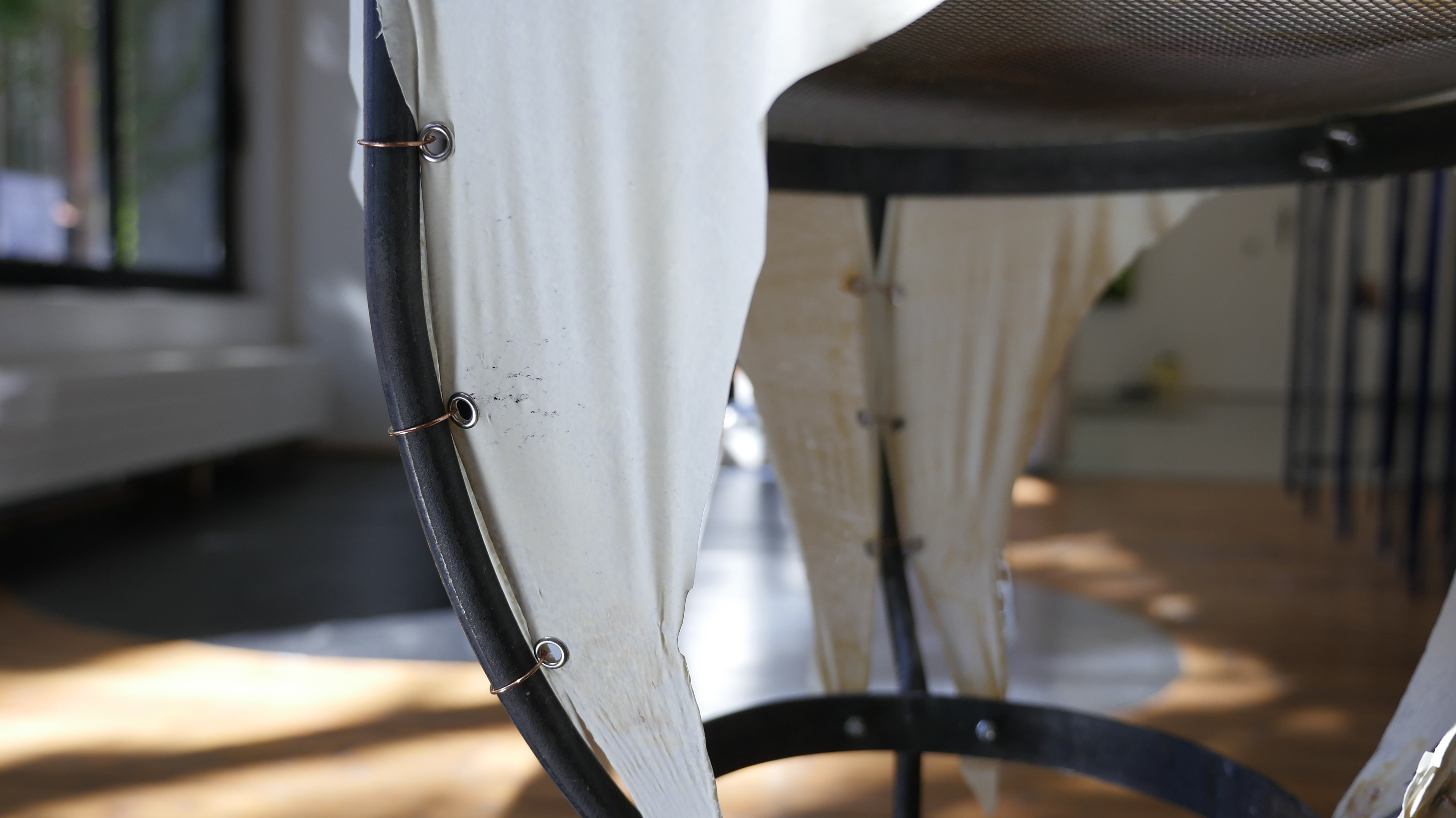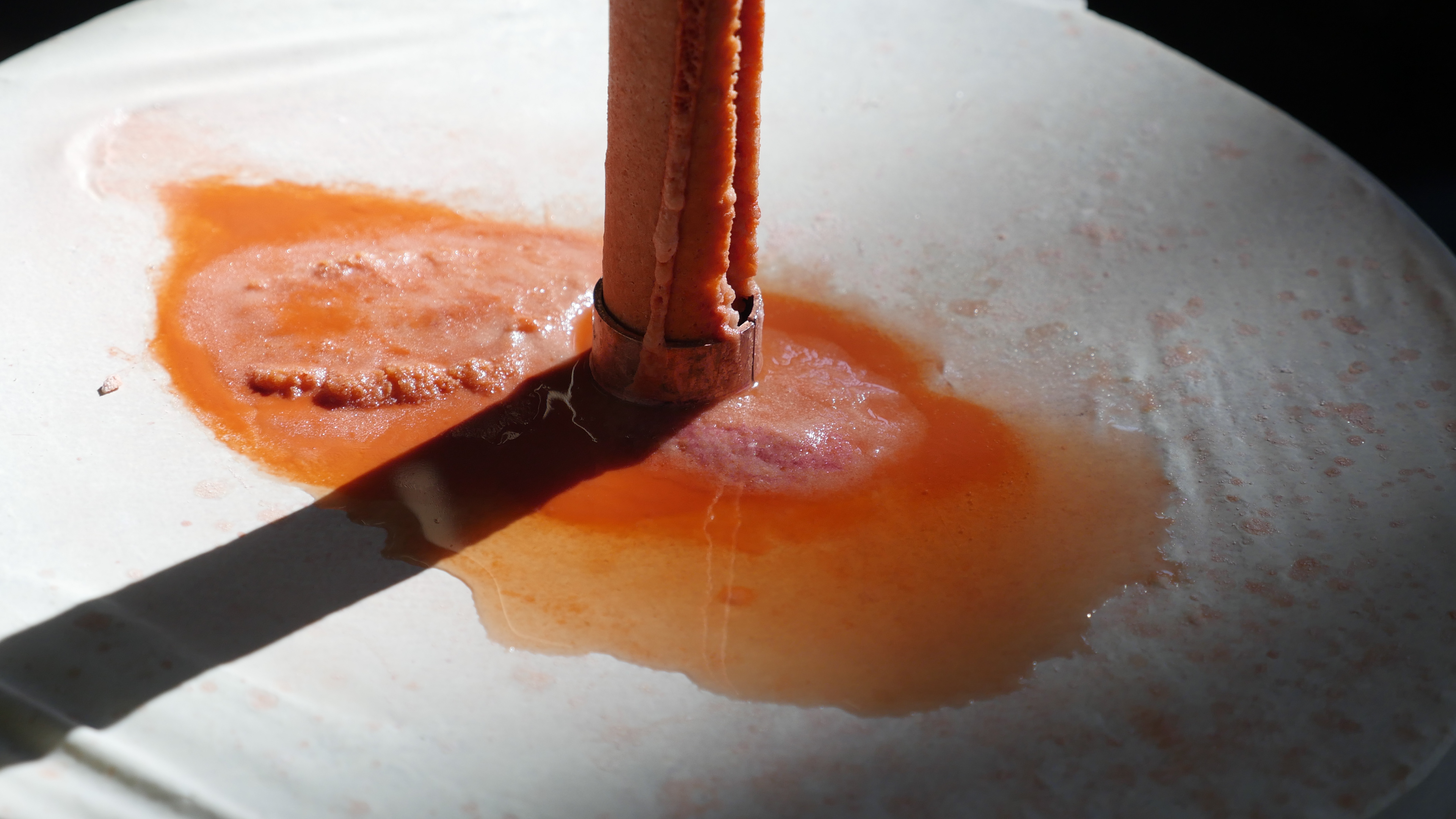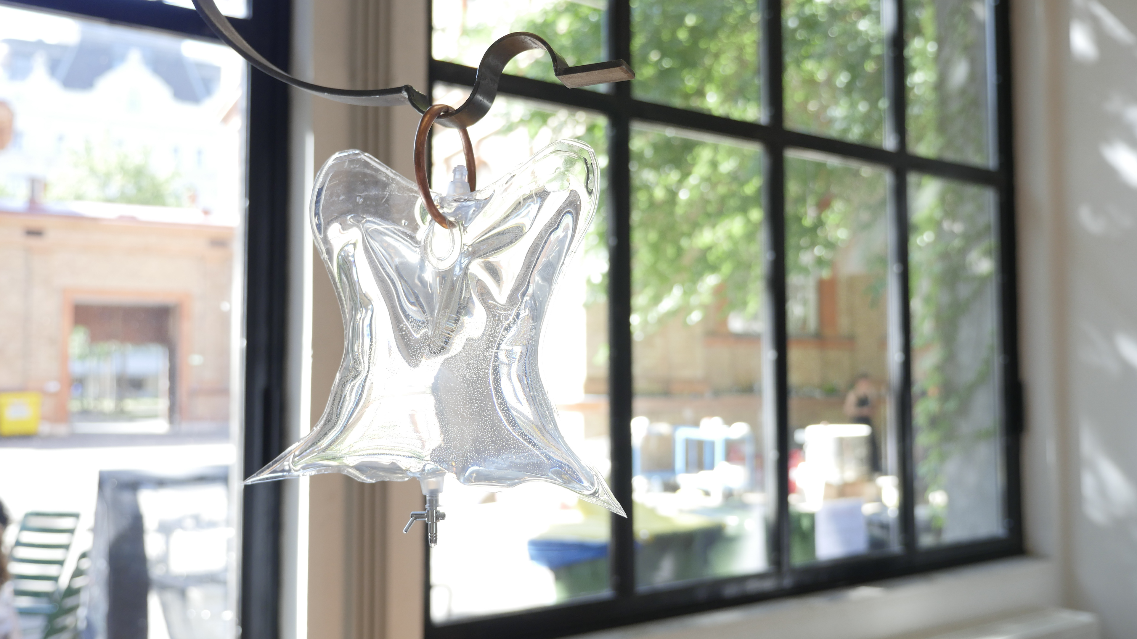 A metal structure suspends a water bag, dripping steadily onto a bath bomb. It fizzes rather than burns, releasing a quiet scent. Evoking medical, ritual, or spiritual, the installation traces a constellation of references—fragile and contradictory. The candle does not burn while the drip does not extinguish. Playing with the slippage between aromatic and (a)romantic, the work gently interrogates normative scripts of intimacy, affect, and decay.