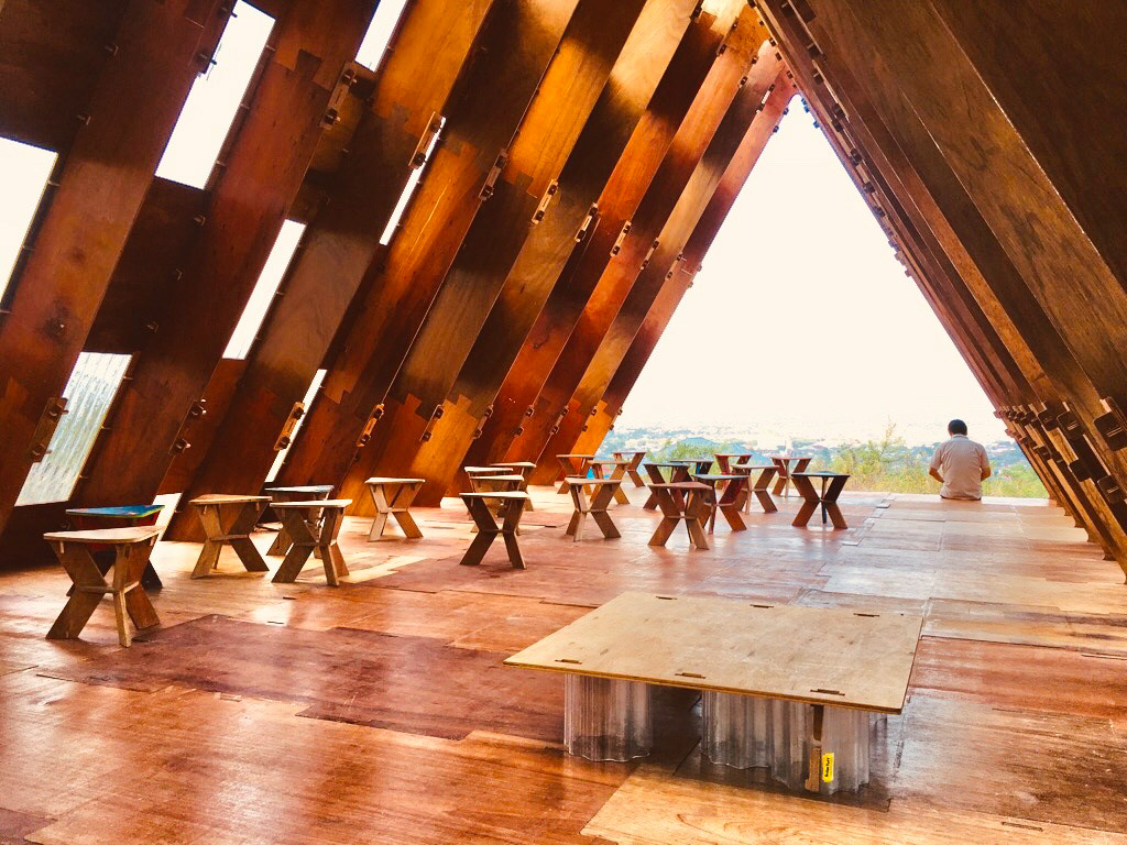 The Palu Community Center was designed and built next to one of the refugee camps. Its unique triangular shape is inspired by the local traditional houses called Rumah Tambi. Plywood boards were pre-cut in the same Sulawe- si Island, then assembled with the locals and architec- ture students from Bandung Institute of Technology and Tadulako University.