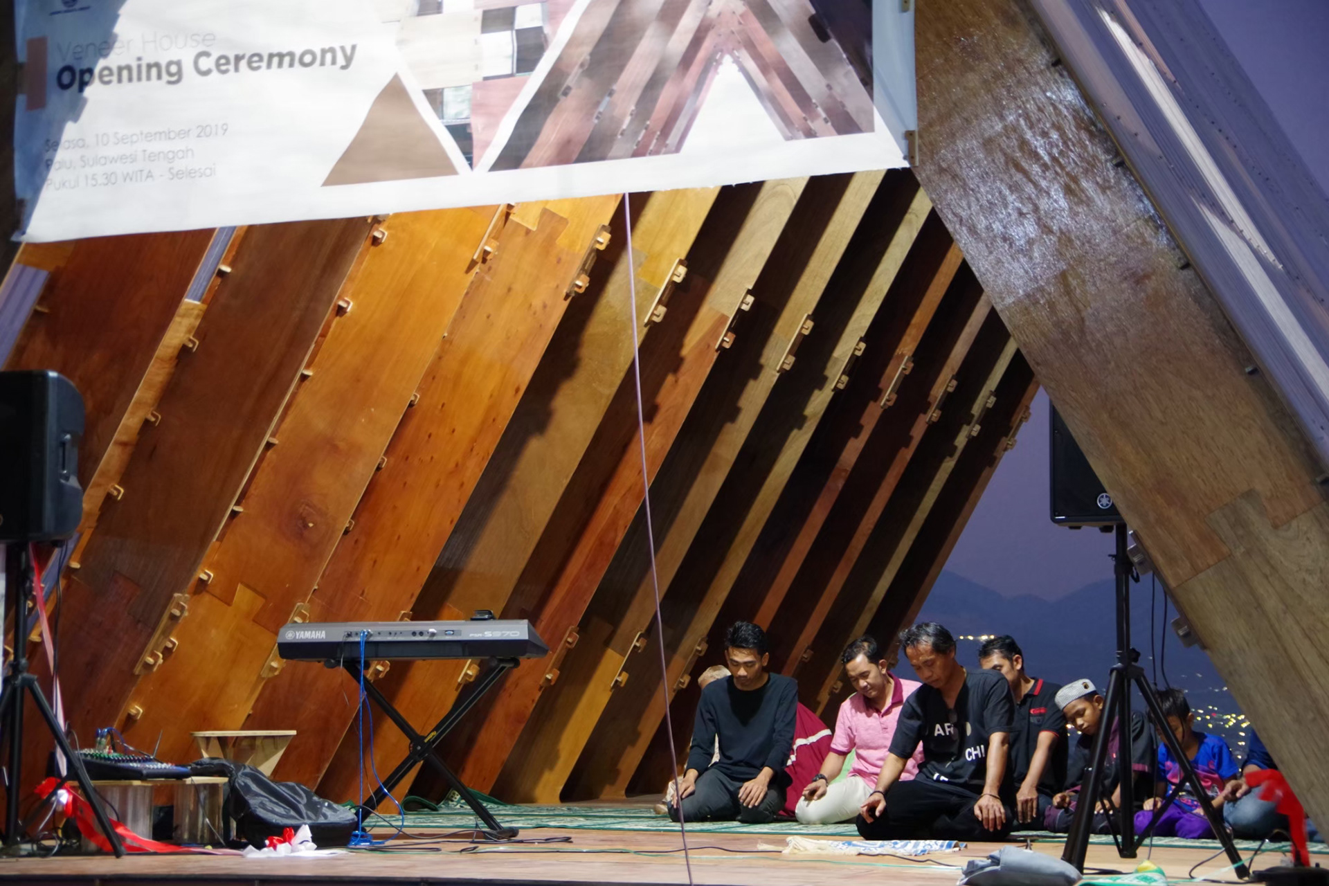こうした状況を受けて、避難キャンプのすぐ横にパル コミュニティセンターの建設が計画された。特徴的な三角の形は、この地の伝統的な住宅 Rumah Tambi に着想を得ている。合板は同じスラウェシ島で現地の職人によってプレカットされ、施工には地元の人々やバンドン工科大学、タデュラコ大学の建築学生らが参加した。