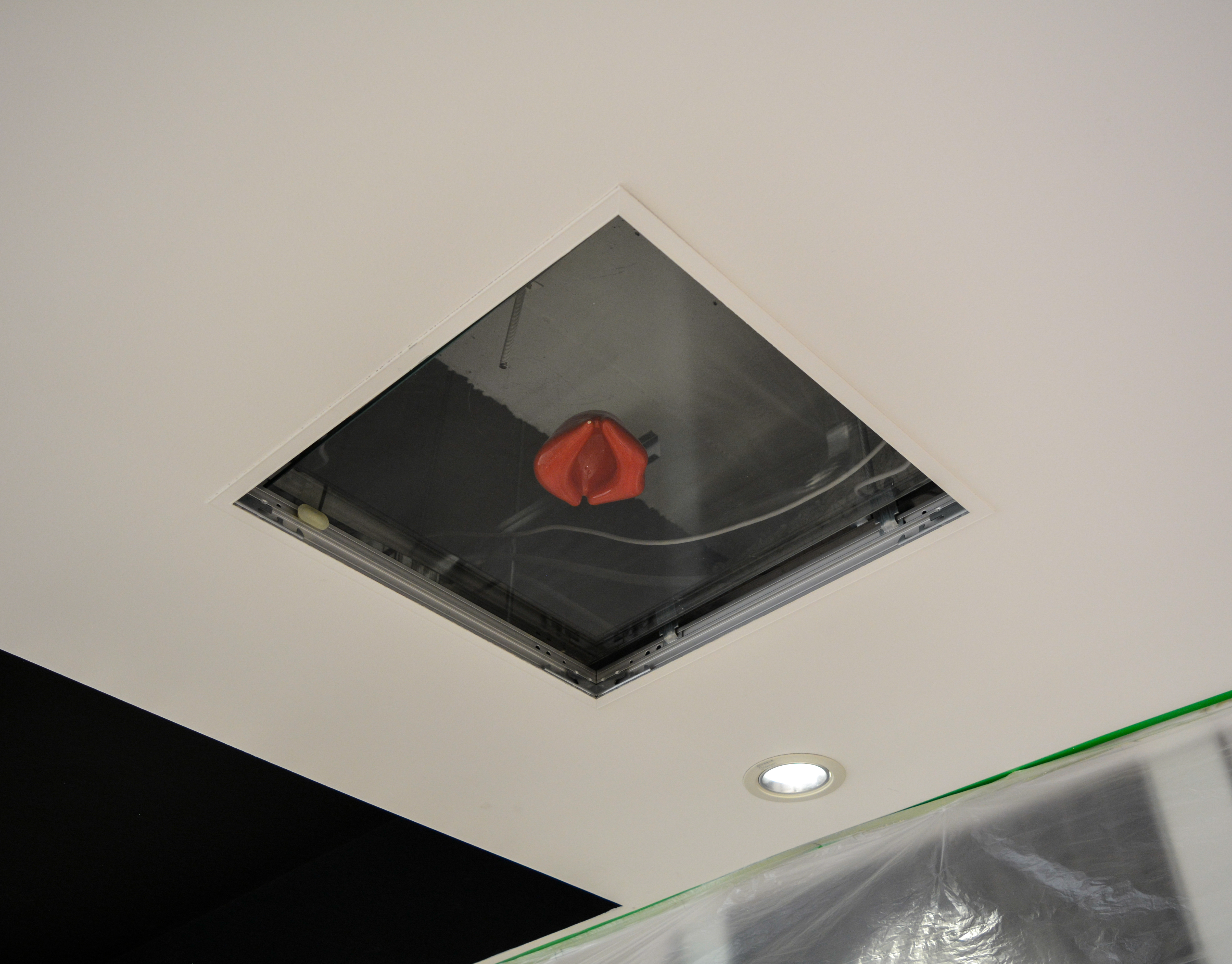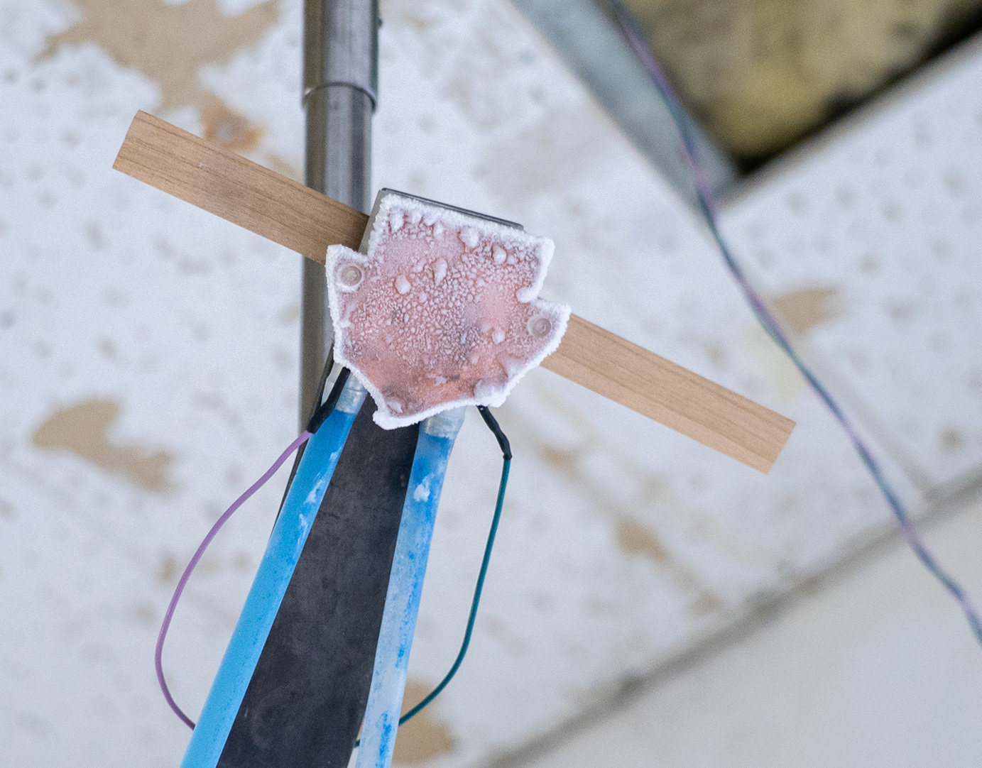 Site-specific installation, metal, wood, latex, water, peristaltic pump, tube, thermochromic pigment, superabsorbent polymer, scent.
